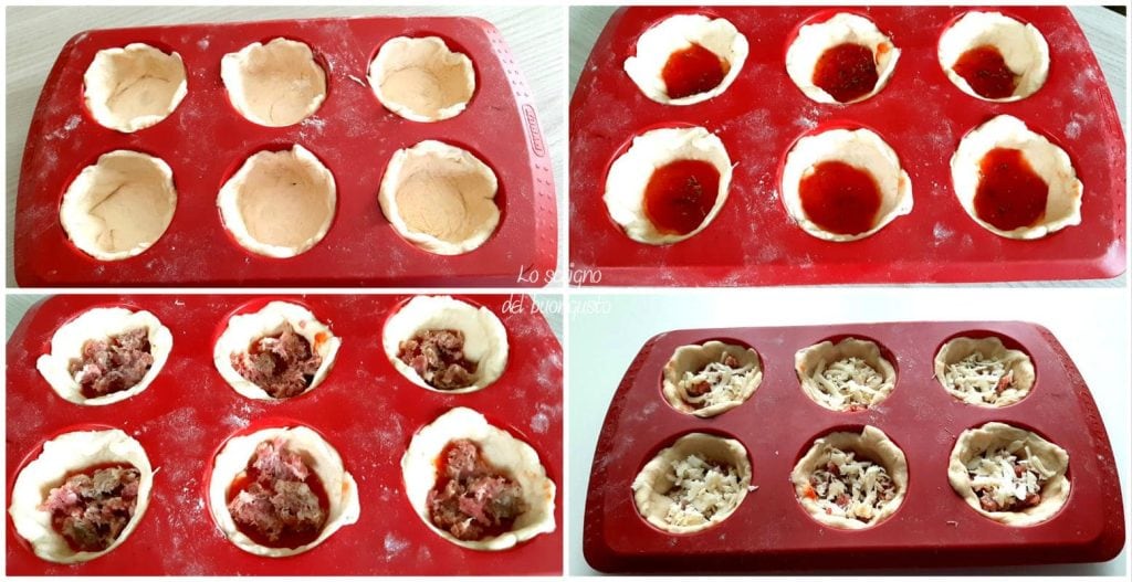 Colocarlos cada uno en un hueco del molde para muffins, condimentar primero con el tomate preparado anteriormente, luego con la pasta de salchicha y finalmente rallar la provola ahumada.