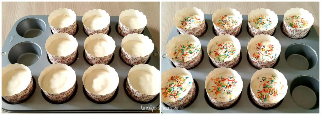 Una vez añadidos todos los ingredientes, llenar los moldes para muffins hasta 1 cm y medio del borde, decorar con los fideos de azúcar e introducir en el horno a 180°C durante 25 minutos.