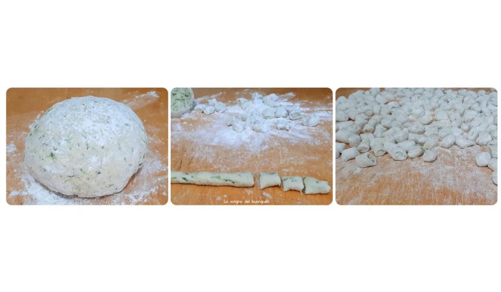 Tomar trozos de masa y formar cordoncitos de aproximadamente un dedo de grosor, ayudándose espolvoreando las manos con harina, después cortar cada cordón en pequeños trozos obteniendo ñoquis.