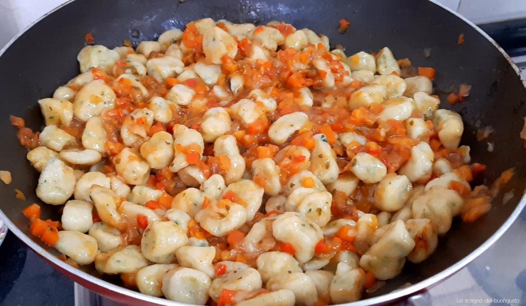 Al cocinar los ñoquis, escurrirlos y verterlos en la sartén con el condimento y completar la cocción, justo el tiempo de amalgamar bien los ñoquis con el condimento.