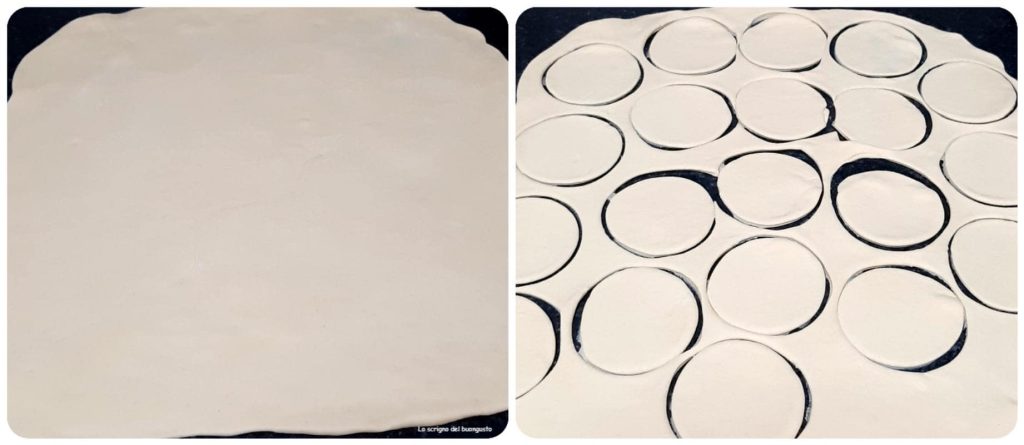 Pasado el tiempo, enharinar ligeramente la superficie de trabajo, extender una lámina bastante fina y con un cortador de pastas sacar círculos de masa.