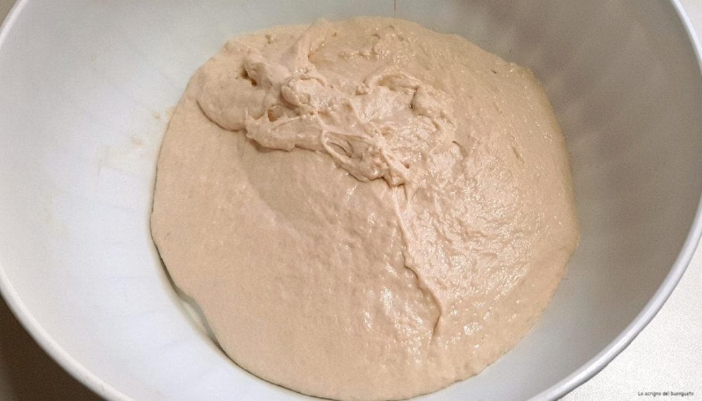 • En un bol poner 100 g de agua y disolver la levadura, luego mezclar y añadir la harina mezclando bien hasta obtener una pasta densa.