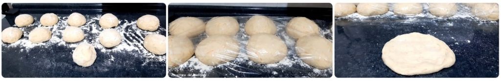 Pasado el tiempo, coger una sartén antiadherente con fondo grueso y calentarla, cuando esté bien caliente, regular el gas a fuego medio-bajo, aplastar las bolitas para crear unas pizzetas no demasiado finas…..