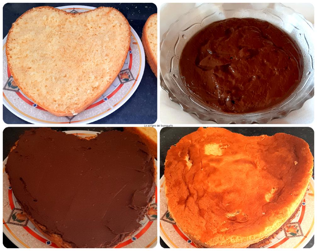 Cortar el bizcocho dividiéndolo en dos partes y mojar la base con el almíbar de ron, extender la crema pastelera de chocolate, luego mojar también la otra mitad del bizcocho y colocarla sobre el bizcocho ya relleno.
