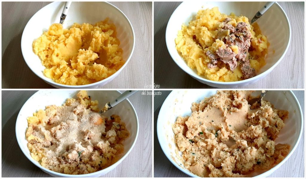 Machacar las patatas, condimentar con sal, el aceite de oliva virgen extra, triturar la mortadela, la provola y el perejil…..si queréis podéis rallar tanto la mortadela como la provola y tener una mezcla menos triturada, unirlos a las patatas, añadir el pan rallado, los huevos, mezclar todo bien hasta amalgamar bien la mezcla.