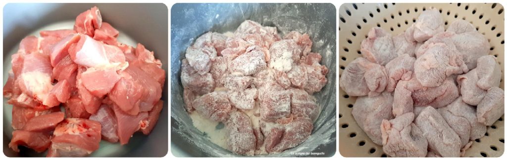 Pasad los trocitos de pavo por la harina y tamizadlos en un colador.