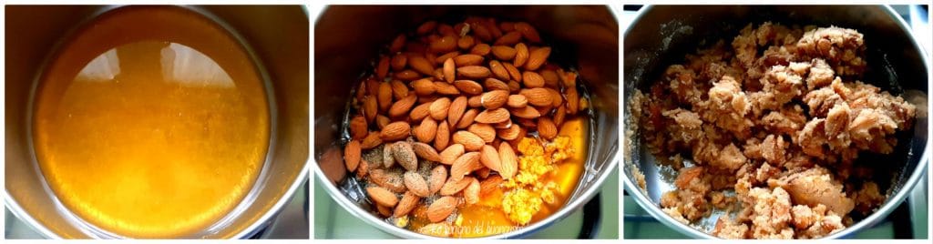En una cacerola de acero poner la miel y calentarla hasta que se vuelva prácticamente líquida, luego apagar y verter las almendras, la pimienta, la cáscara rallada de las naranjas y mezclar bien.