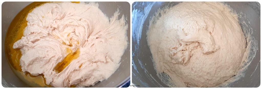 Agregar la sal, el aceite de oliva v.e., 50 gr de agua fría y trabajar la masa integrándola bien durante unos 10 minutos.