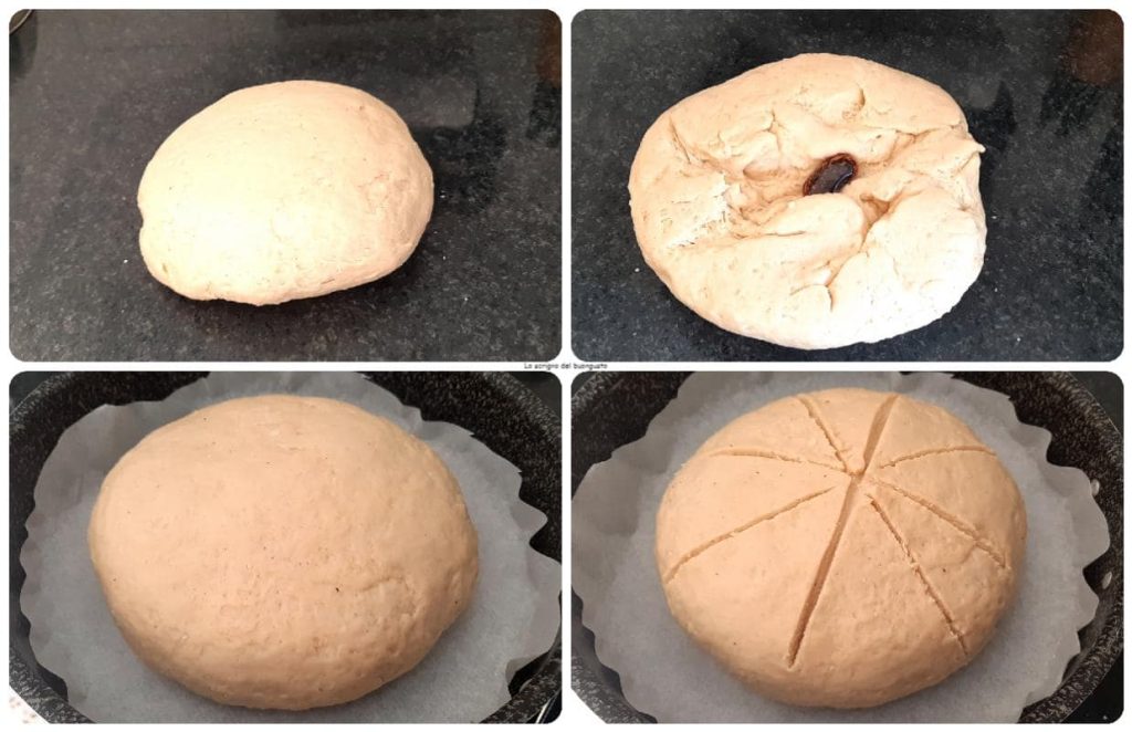 Redondear bien la hogaza, cortar la superficie obteniendo 6 porciones e introducir en el horno caliente a 180°C durante 40 minutos controlando la cocción.
