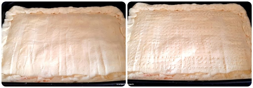 Tomar una bandeja aproximadamente del tamaño indicado en los ingredientes, engrasarla y colocar la primera masa de pizza haciendo que sobresalga ligeramente en cada lado.