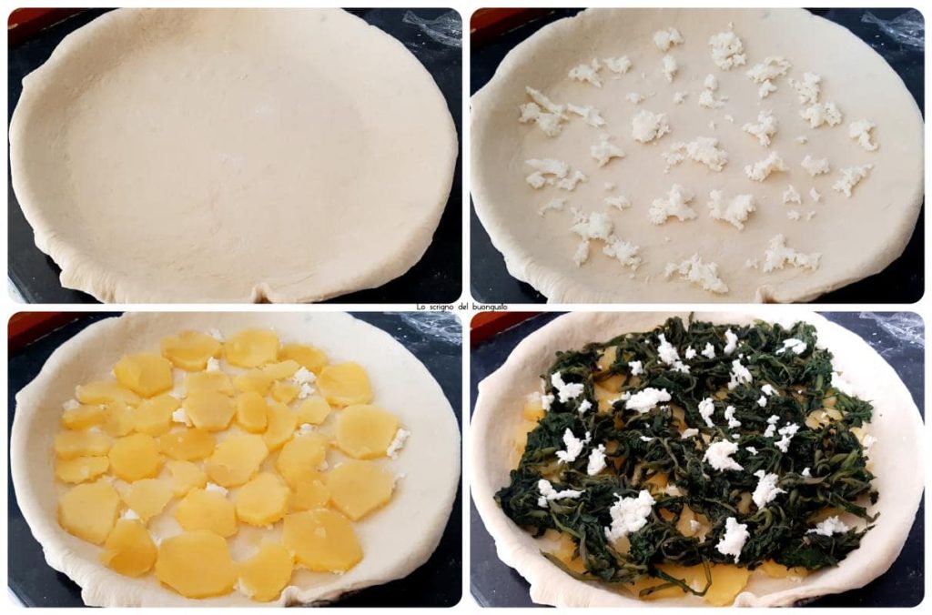 Colocar la lámina en nuestro molde de manera que la masa sobresalga un poco en los bordes, cubrir la base con una parte de mozzarella desmenuzada, luego hacer una capa con las rodajas de patata, condimentar con un hilo de aceite y una pizca de sal.