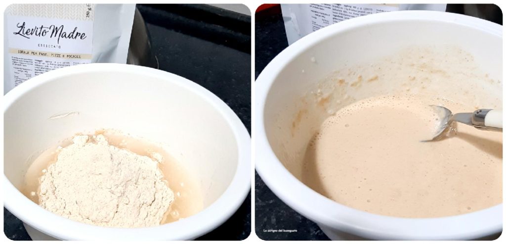 Una vez conseguida la leudación, tomamos la batidora planetaria colocando el gancho de hoja (pero también podemos hacerlo a mano mezclando bien para luego trabajar un poco más la masa), ponemos 510 ml de agua a temperatura ambiente, añadimos el lievitino y mezclamos bien.