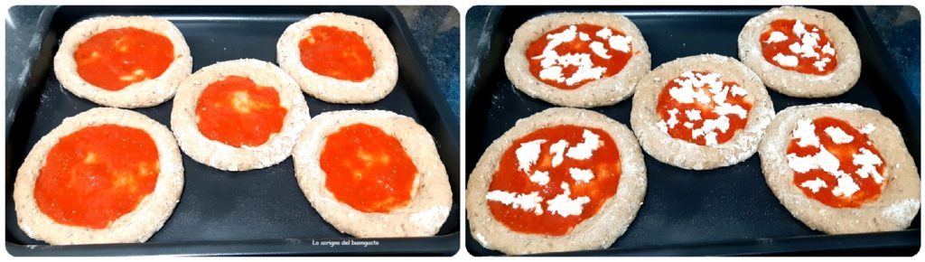 Calentamos el horno a la máxima temperatura y mientras tanto con una cuchara repartimos el tomate condimentado sobre la superficie, luego desmenuzamos la mozzarella y horneamos a 250°C (o más si el horno lo permite) y cocinamos durante unos 10 minutos, depende del horno.