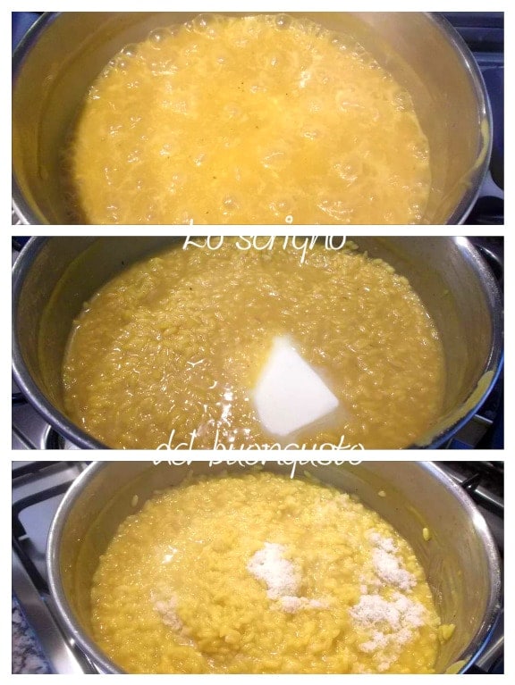 Al final de la cocción, retirar el arroz del fuego, añadir los 10 g de mantequilla, mezclar bien, añadir 2 cucharadas de Parmigiano Reggiano y mezclar bien.