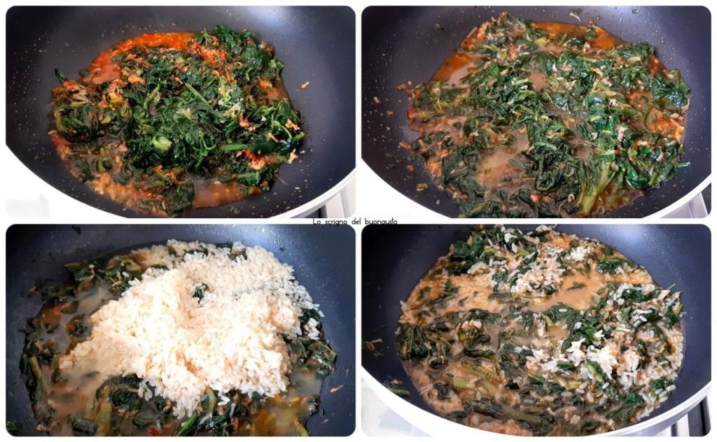 Mezclar bien la verdura y luego añadir el arroz junto con el agua caliente o el caldo reservado.