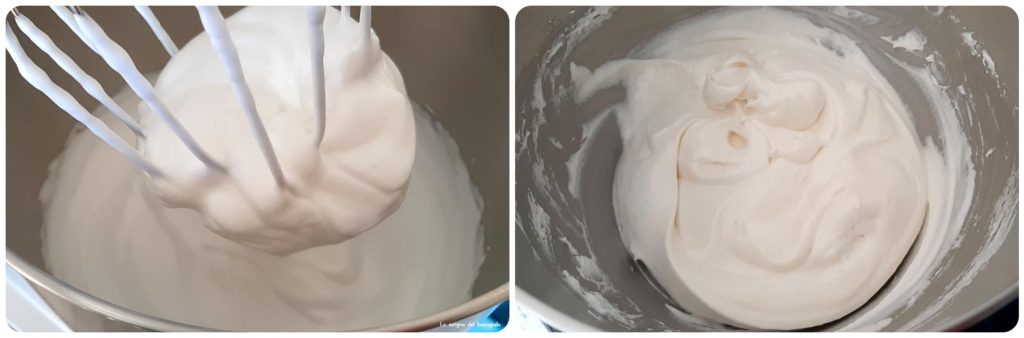 • En la batidora para dulces o en la amasadora, batir las claras con el azúcar a punto de nieve.
