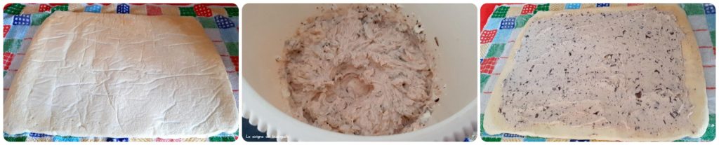 Mientras tanto, el rollo se habrá enfriado, despegarlo del papel de horno y colocar la parte donde estaba pegado el papel de horno hacia arriba.