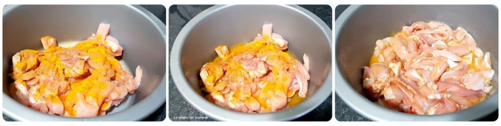 • ….ponlos en un bol grande y condiméntalos con la sal, la pimienta, una pizca de cúrcuma y curry, 1 cucharada de aceite de oliva virgen extra, el vino blanco y mezcla bien todo.