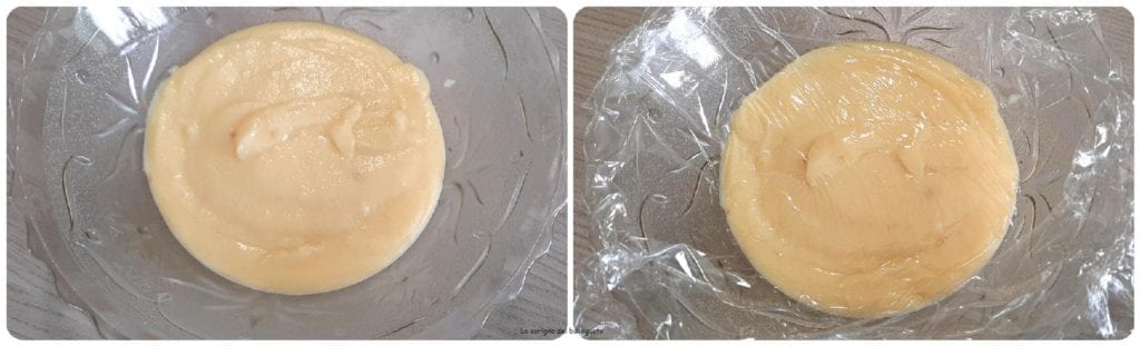 Vertemos en un recipiente y cubrimos con film plástico de cocina haciéndolo adherir a la crema para evitar costritas en la superficie, dejamos templar para luego poner en la nevera al menos 2 horas, o ½ hora en el congelador.