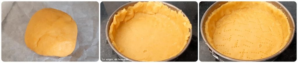 Tomar un molde, preferiblemente desmontable de 24 cm de diámetro, colocar la hoja de papel de hornear que usamos para estirar la masa solo en la base, y luego cortar el exceso.