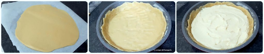 Tomar la masa quebrada y dividirla a la mitad, crear un disco y colocarlo en un molde de 26 cm de diámetro previamente enmantecado y enharinado.