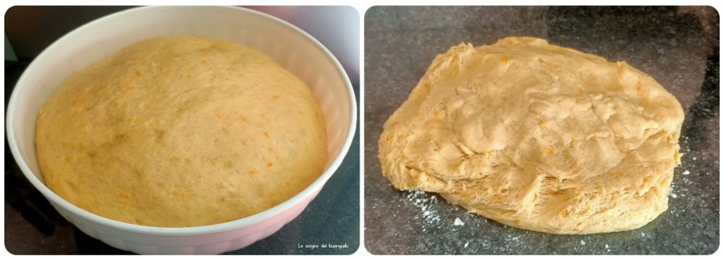 Pasado el tiempo de levado, añadir los huevos uno a uno, el azúcar, la ralladura de limón y de naranja, la mantequilla ablandada y la harina poco a poco, integrando bien todo.