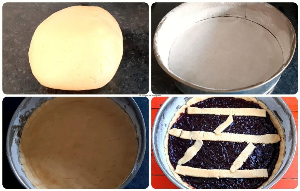 La base de pasta brisa con una masa realmente sin demasiadas pretensiones, para luego rellenarla con la mermelada de cerezas, que en este caso fue hecha por mí durante el verano… sí, me llevó un poco de tiempo quitar los huesos, pero es una mermelada que tal vez solo pueda ser superada por nuestra mermelada de uva abruzzese.