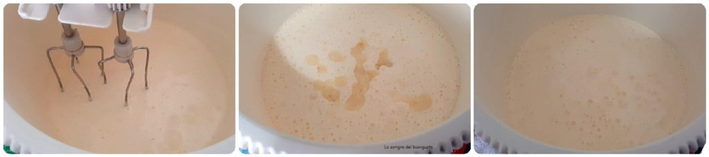 Una vez que los huevos estén bien esponjosos, añadimos la mezcla de mantequilla y leche y mezclamos bien.