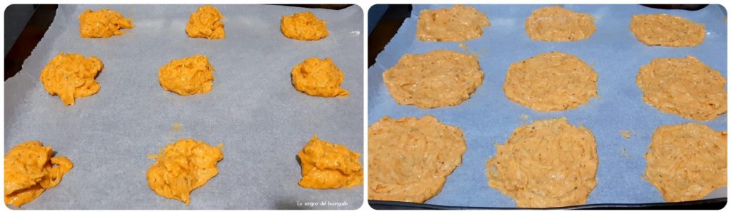 Preparamos las bandejas necesarias para cocinar nuestras tortitas, forrarlas con papel de horno, luego tomamos cucharadas de la masa y hacemos montoncitos bien espaciados en la bandeja, posteriormente con el dorso de una cuchara aplastamos hasta hacerlas muy finas.