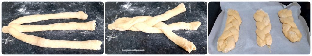 Colocar las trenzas en una bandeja de horno forrada con papel de horno y dejar leudar por un par de horas o hasta que doblen su tamaño.
