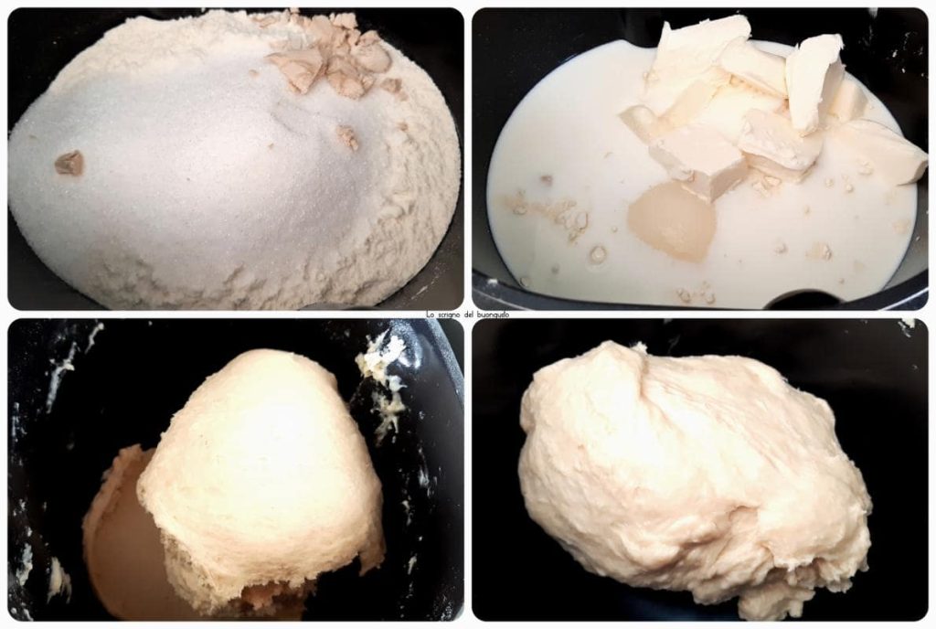 En el recipiente de la batidora, introduce la leche y la levadura, déjala disolver, luego añade la mitad de la harina y amasa.