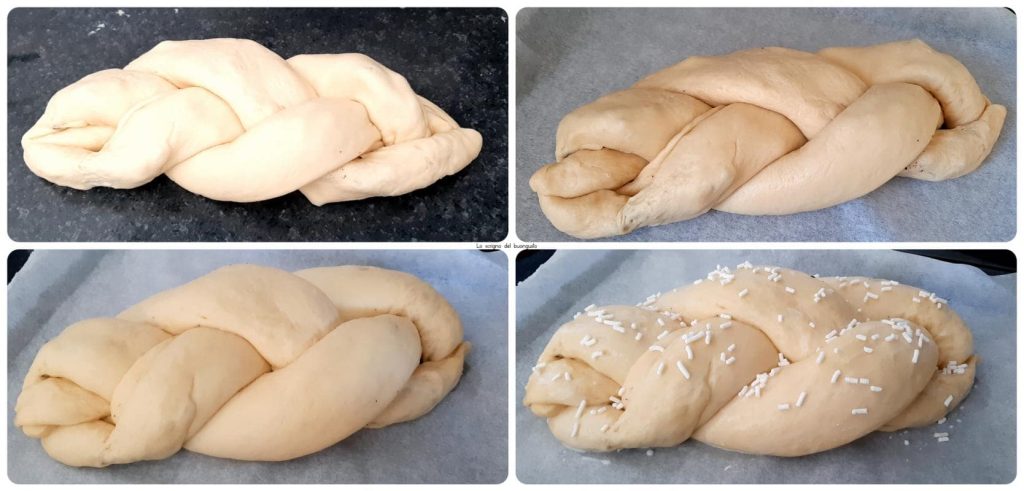 Después de esta última fermentación, pinta nuestra trenza con leche y ponle granillos de azúcar.