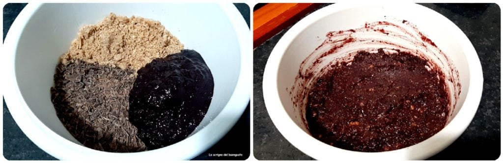 En un bol ponemos las almendras bien picadas, el chocolate extra negro rallado o picado finamente y la mermelada de uva, mezclamos bien y lo ponemos también en la nevera cubierto con film al menos 1 hora.