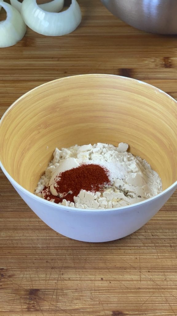 Extrae delicadamente los aros sin romperlos y reserva la parte central de las rodajas para otras preparaciones.Añade a la harina 00 una pizca de ajo en polvo, sal, pimienta negra y media cucharadita de pimentón ahumado. Mezcla bien para integrar todos los ingredientes secos entre sí.