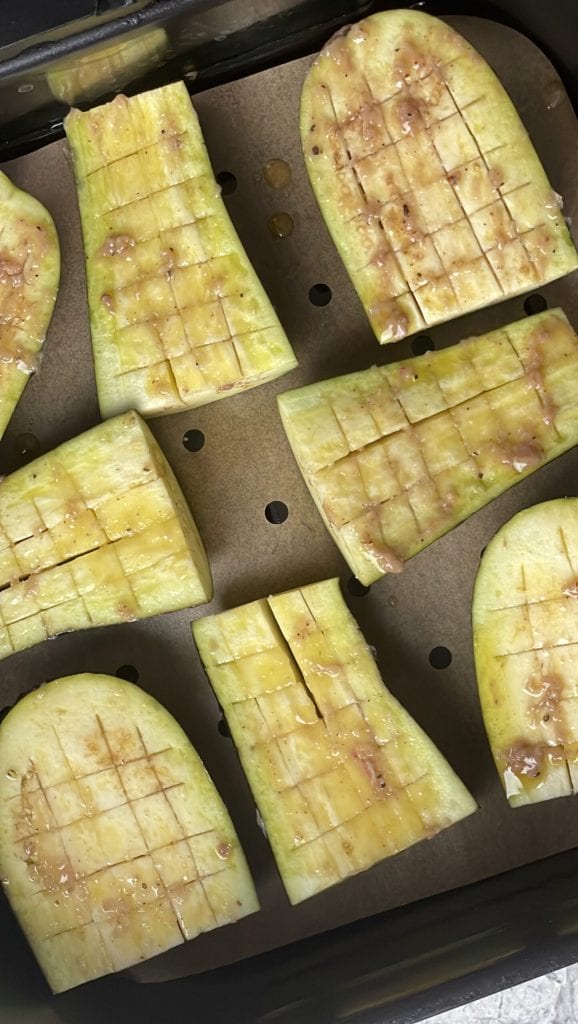 • Transfiere las berenjenas al cestillo de la freidora de aire.