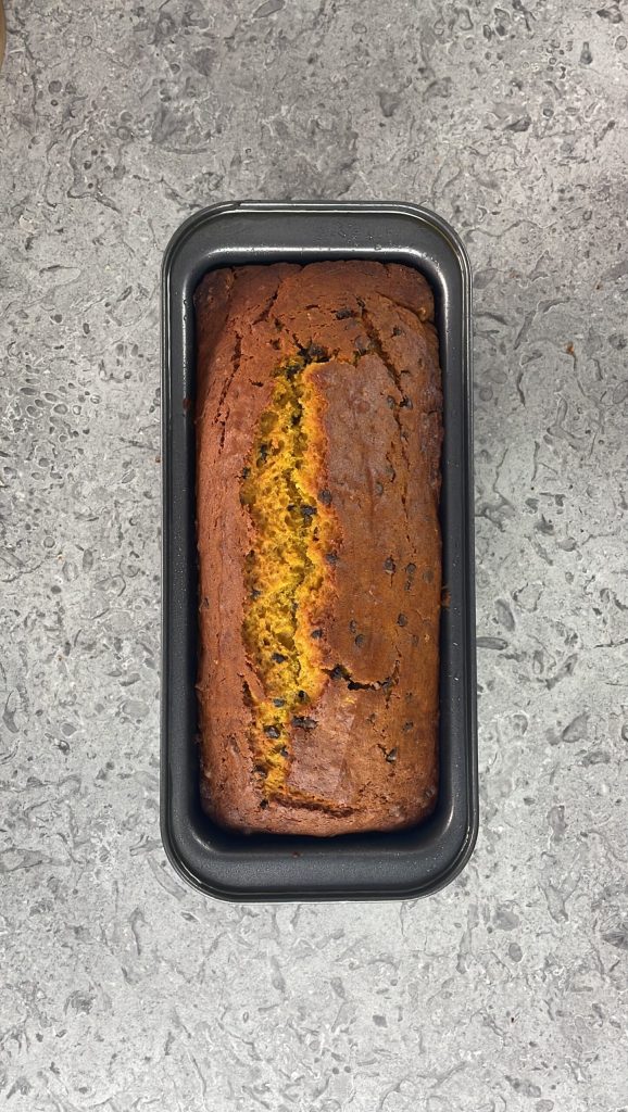 Bizcocho de Calabaza suave y especiado, un bizcocho de calabaza enriquecido con canela y trozos de chocolate, ideal para el desayuno o la merienda, para disfrutar con una taza de té, café o chocolate caliente.