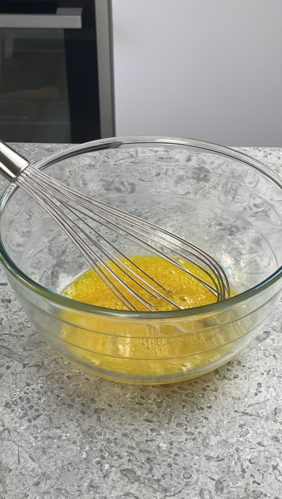 Comienza la preparación del bizcocho salado con parmesano batiendo los huevos con una pizca de sal, utilizando un batidor de mano.