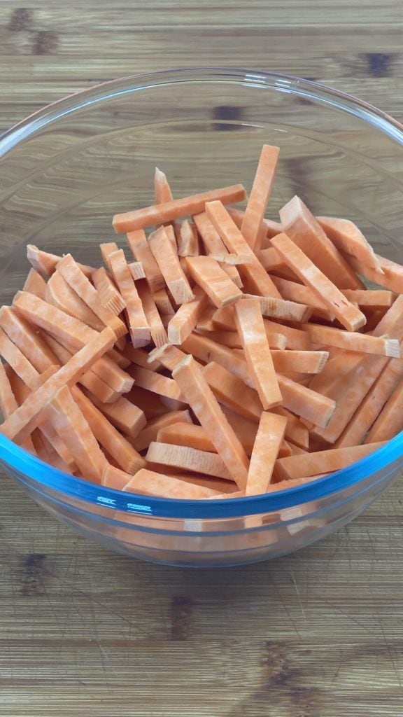 Empieza la preparación de los boniatos especiados en freidora de aire pelando el boniato y cortándolo en bastones. El mío era bastante grande con un peso de unos 500g y solo usé uno.