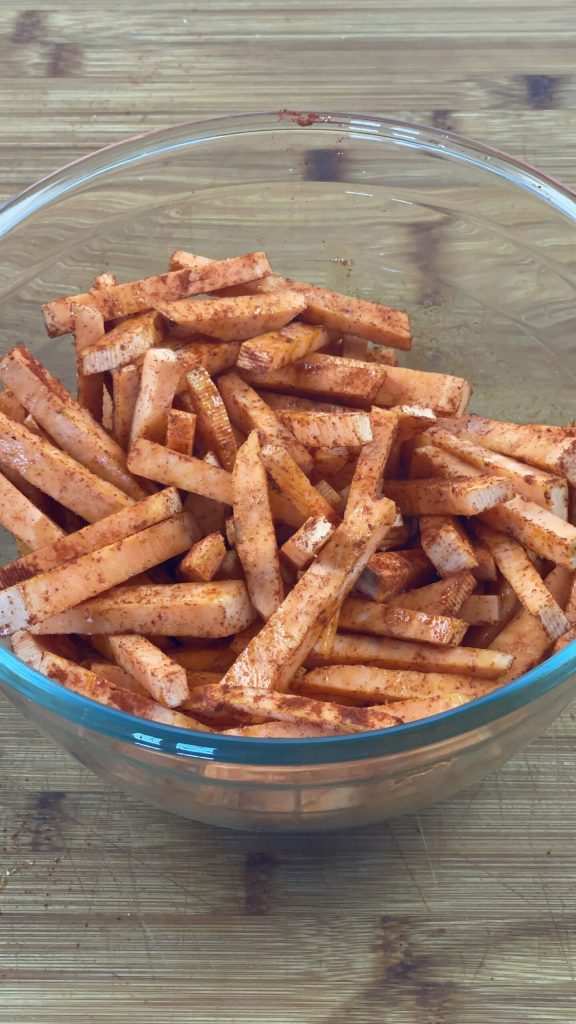 Boniatos especiados en freidora de aire, un acompañamiento simple y delicioso que se prepara en menos de 30 minutos.