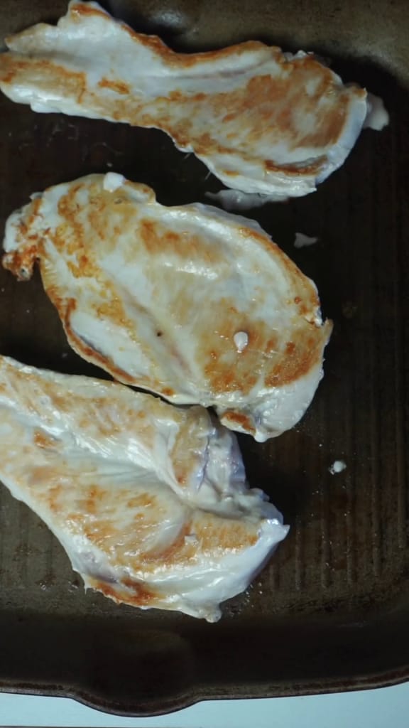 • Calienta una parrilla y cocina las rebanadas de pechuga de pollo hasta que estén bien doradas.