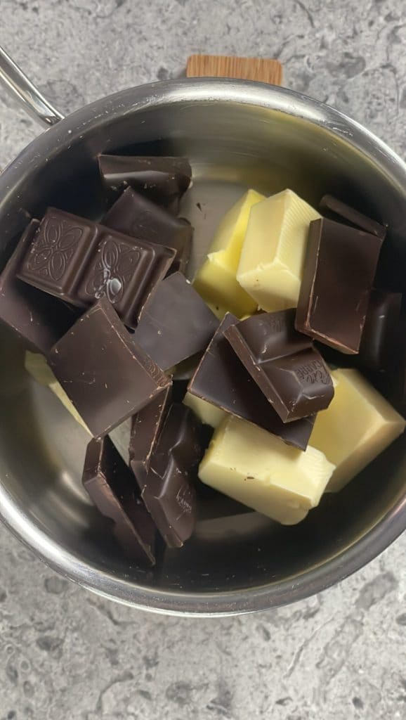 • Comienza la preparación de los brownies de naranja derritiendo en una cacerola la mantequilla y el chocolate negro a fuego lento, tardará unos minutos.
