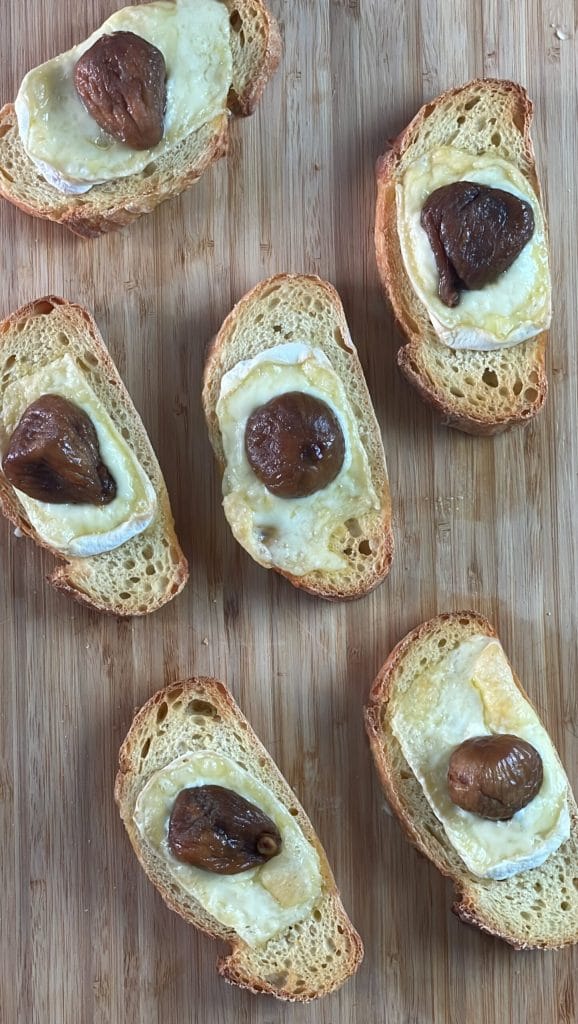 Bruschettas de brie y higos secos, un aperitivo sencillo y elegante que combina la crocancia del pan rústico tostado con la cremosidad del brie y la dulzura de los higos secos.