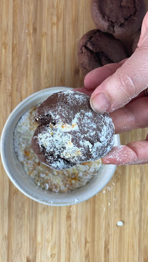 Mezcla con una cuchara hasta que la cáscara esté distribuida de manera homogénea en el azúcar.Solo queda cubrir los buñuelos de cacao con el azúcar glas aromatizado con naranja.