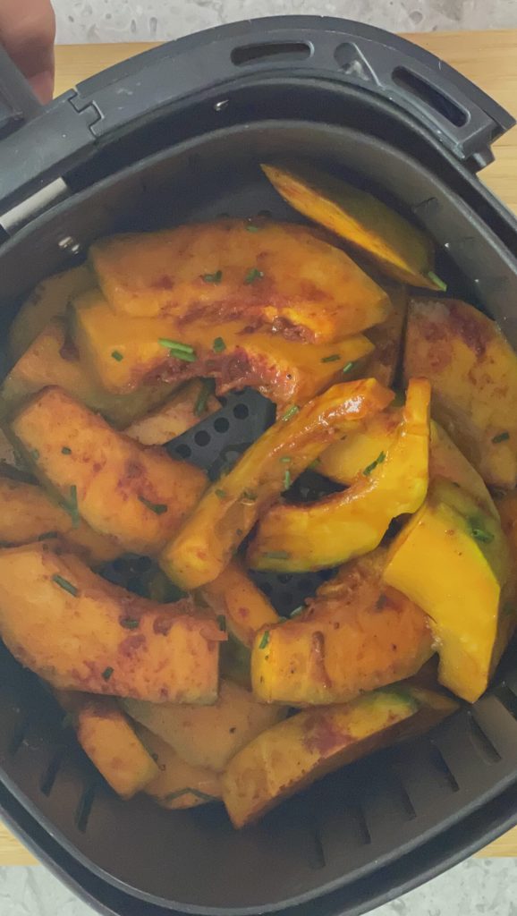 Añade la calabaza directamente en la cesta sin bandejas ni papel de horno.Cocina la calabaza especiada en freidora de aire durante 20 minutos.