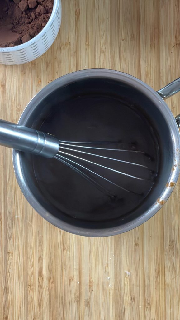 Añade el chocolate negro y continúa la cocción hasta que el chocolate se derrita mezclando con las varillas.Vierte el chocolate en una taza y déjalo templar durante unos minutos (no más de 5).
