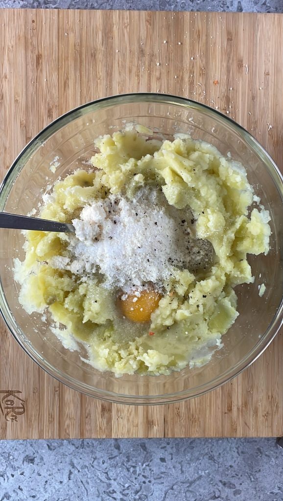 • Añade a las patatas trituradas una yema de huevo, el caldo de carne, sal, pimienta negra y queso parmesano rallado.