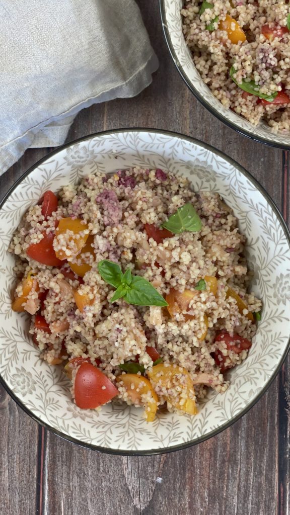 Añade al gusto también algunas hojas de albahaca.Sírvelo de inmediato el cous cous salmón y tomatitos o consérvalo en el frigorífico hasta el momento de servirlo.