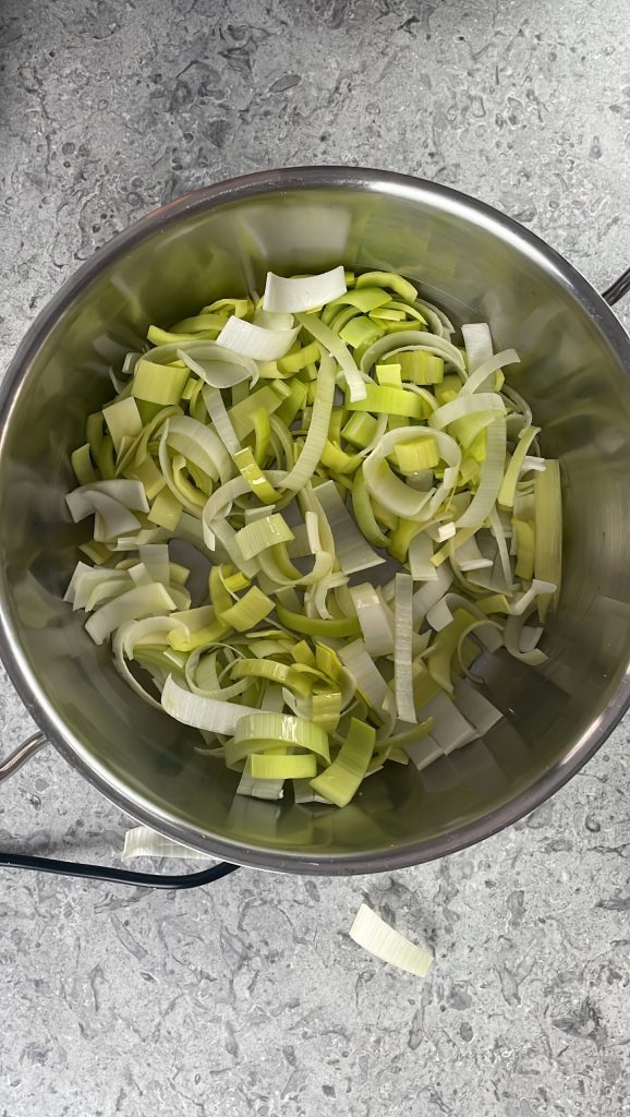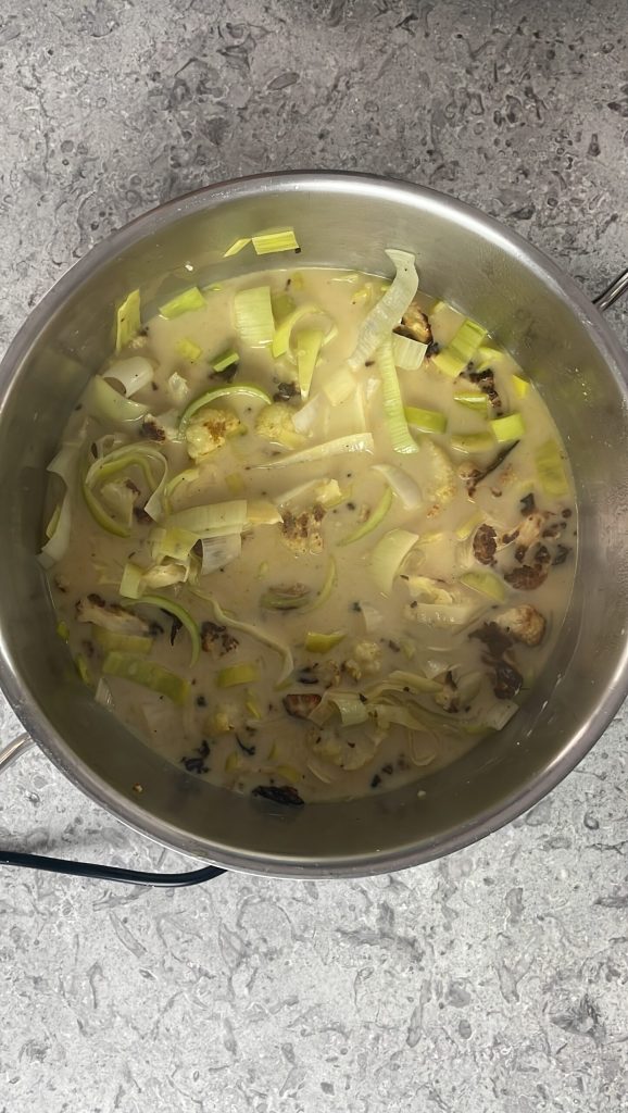 Añade al puerro el coliflor asado (elimina el limón pero deja el ajo) y la leche.