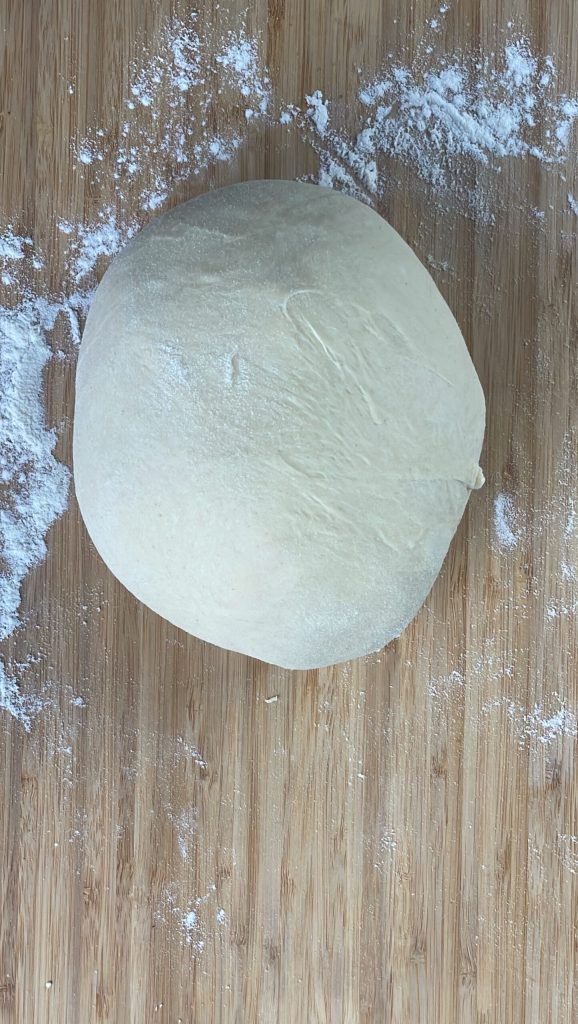 Transfiérela a una tabla de amasado ligeramente enharinada, dale una forma redonda y déjala reposar hasta que duplique su tamaño.Recupera la masa fermentada, aplánala y alárgala ligeramente con las manos.