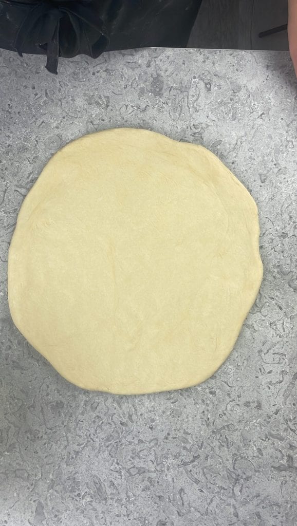 Extiéndela con el rodillo a un grosor de aproximadamente medio centímetro tratando de formar un círculo.
